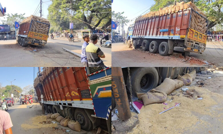ବଲାଙ୍ଗିର;୧୬/୦୧(ମୋର୍ ସମିୟା) ବଲାଙ୍ଗିର ପୁରୁଣା ପ୍ରାଇଭେଟ୍ ବସ୍ ଷ୍ଟାଣ୍ଡ ପାଖେ ଥିବାର ପେଟ୍ରୋଲ ପମ୍ପ ଭିତର କେ ଢୁକିଗଲା ଧାନ ବୋଝେଇ ଟ୍ରକ୍ (ଓଡ଼ି ୦୩ ଏସି ୮୮୭୭) । ରାସ୍ତା ତରା କେ ଥିବାର ଲାଇନ୍ ଖୁଣ୍ଟା କେ ଧକ୍କା ଦେବାର ପରେ ପେଟ୍ରୋଲ ପମ୍ପ ରେ ଲାଗିଥିବାର ସୁରକ୍ଷା ବାଡ଼ା କେ ଧକ୍କା ଦେଇଥିଲା ଟ୍ରକ୍ । ବିଳମ୍ବିତ ରାତି ରେ ଇ ଦୁର୍ଘଟଣା ହେଇଥିବାର ନୁ ବଞ୍ଚି ଯାଇଛେ ଧନ ଜୀବନ । ରାତି ରେ ନୋ ଏନ୍ଟ୍ରି ଖୁଲବାର ପରେ ସହର ଭିତରେ ଟ୍ରକ ମାନେ ବହୁତ୍ ଦ୍ରୁତ ଗତି ରେ ଯାଉଛେ ଇ ଥିର୍ ଲାଗି ସହର ଭିତରେ ବାରମ୍ବାର ଦୁର୍ଘଟଣା ହେଉଥିବାର କହୁଛନ ଅଞ୍ଚଲବାସି । ଗାଡ଼ି ଚାଲକ ର ଆଖି ଲାଗି ଯାଇଥିବାର ନୁ ଦୁର୍ଘଟଣା ଘଟି ଥିବାର ସୂଚନା । ଦୁର୍ଘଟଣା ରେ ଧକ୍କା ଦେଇଥିବାର ଲାଇନ ଖୁଣ୍ଟା ପଡ଼ି ଯାଇଥିବାର ନୁ ବହୁତ୍ ସମିୟା ଧରି ବିଦ୍ୟୁତ୍ ସରବରାହ ବନ୍ଦ ରହିଥିଲା । ଖବର ପାଇ ଘଟଣା ସ୍ଥଳରେ ବିଦ୍ୟୁତ୍ ବିଭାଗ ର କର୍ମଚାରୀ ପହଞ୍ଚି ମରାମତି କରିଥିଲେ ।